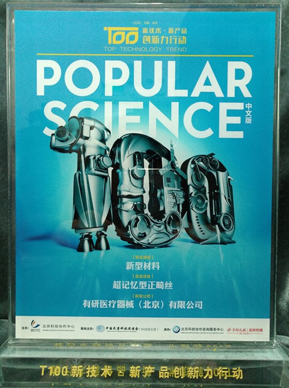 2016年11月11日,“T100新技術(shù) 新產(chǎn)品 創(chuàng)新力行動(dòng)發(fā)布盛典”在國(guó)家會(huì)議中心舉行。有研醫(yī)療器械(北京)有限公司申報(bào)的“超記憶型正畸絲”產(chǎn)品最終入榜“2016中國(guó)新技術(shù) 新產(chǎn)品 創(chuàng)新力行動(dòng)TOP100”。
