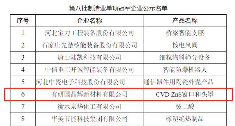 近日,工業和信息化部第八批制造業單項冠軍企業結束公示,有研國晶輝新材料有限公司榜上有名。
