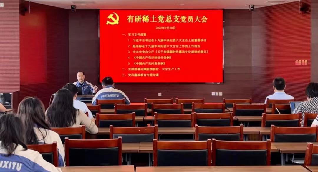 為進一步加強黨風廉政建設教育宣傳工作,筑牢廣大黨員防腐拒變思想防線,有研稀土黨總支于9月28日召開黨員大會,開展黨風廉政教育和違規違紀警示教育。黨總支全體黨員、干部在燕郊基地主會場參加會議,樂山稀土黨支部、榮成稀土-青島稀土黨支部黨員通過視頻參會。黨總支副書記、紀檢委員、副總經理許國棟主持會議。