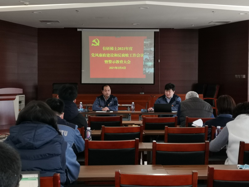 2021年2月4日,有研稀土2021年度黨風廉政建設和反腐敗工作會議暨警示教育大會在燕郊基地召開。有研新材黨委委員、紀委書記劉慧舟視頻參會并講話,公司黨總支書記、總經理于敦波做警示教育講話,公司領導班子成員、各黨支部委員、中層管理人員以及關鍵崗位人員50余人在現場參加會議,各子公司高管、支部委員等視頻參會。公司黨總支副書記、副總經理許國棟主持會議。