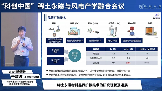 有研稀土15名科研人員做了會議報告,分享本領域的最新研究成果。其中于敦波正高級工程師在“科創中國”稀土永磁與風電產學融合會議上做了題為《稀土永磁材料晶界擴散技術的研究現狀及進展》的大會邀請報告,楊娟玉、劉元紅、余金秋、趙龍勝、吳道高分別做了題為《高端顯示玻璃基板用CMP鑭鈰基稀土拋光材料及其應用關鍵技術》《高品質照明與顯示用紅色熒光粉的信賴性提升研究》?《閃爍晶體用高純無水稀土鹵化物——現狀與展望》 《離子型稀土礦硫酸鎂選擇性強化浸取過程調控》 《高純金屬鉺的熱變形行為及組織演變》的分會場邀請報告。