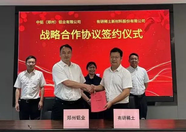 7月8日,有研稀土新材料股份有限公司與中鋁(鄭州)鋁業有限公司合作框架協議簽約儀式在有研大廈舉行。中國有研首席科學家、中國工程院院士黃小衛,有研稀土總經理劉榮輝,鄭州鋁業總經理熊林等人共同見證簽約。有研稀土副總經理張彤、鄭州鋁業副總經理石亞飛分別代表雙方簽署合作框架協議。